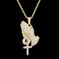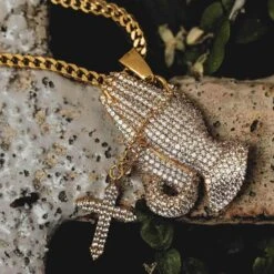 The “Iced Praying Hands” pendant brings a new dimension to a classic piece with the addition of a miniature ball chain and a hanging cross.