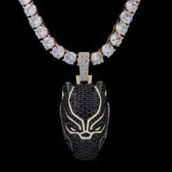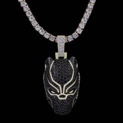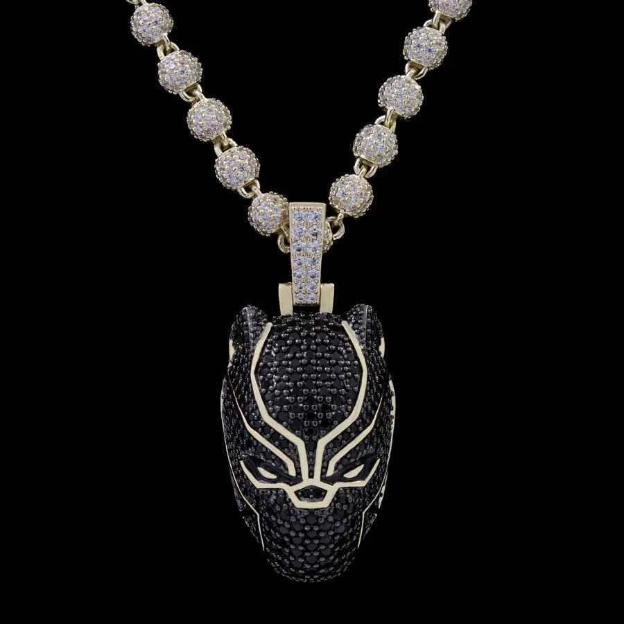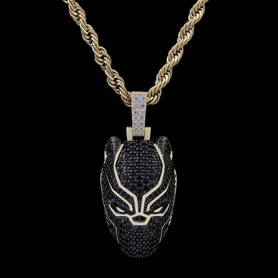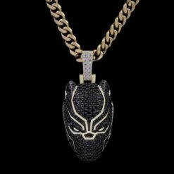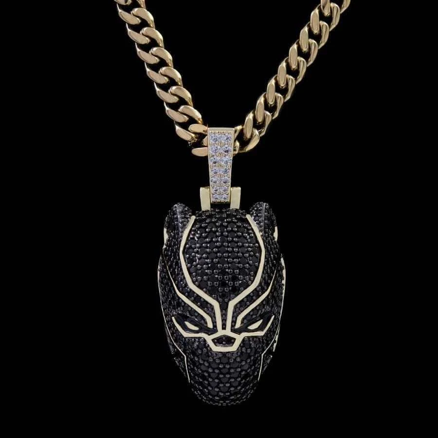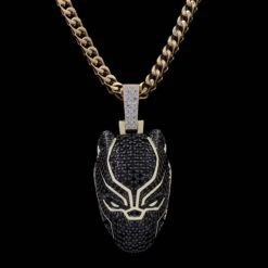 Introducing the Official pendants of the MARVEL Universe. This iconic piece is fit for a true king. Flooded in hand-set black round cut stones, finished in 18k Gold Plating, this pendant is crafted to accurately depict King T’Challa himself. Honor the spirit of “Wakanda Forever!” with the official Black Panther Pendant.