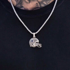 GLD has teamed up with the National Football League to introduce the official NFL Team Helmet Pendants. This piece was meticulously crafted with clear hand-set stones and blue enamel to accurately depict the helmets of the Cowboys. Flex this NFL season with the official pendant of the Dallas Cowboys!