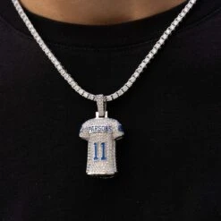 Introducing the Micah Parsons Jersey Pendant. GLD has teamed up with the National Football League to introduce the official NFL Sculpted Jersey Pendant. Micah Parsons was drafted by the Cowboys in the first round of the 2021 draft and followed it up by winning defensive rookie of the year. Best of all he was rocking his GLD logo pendant on draft night, and often is spotted wearing his GLD on field. This piece was meticulously crafted with clear CZ stones and 14k White Gold plating to accurately depict the real life jersey of the Dallas Cowboys. Flex your favorite player this season with the official #11 pendant!