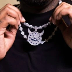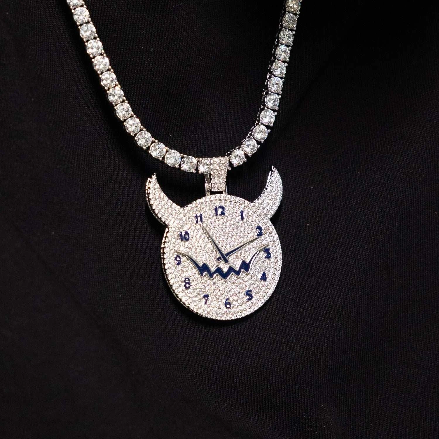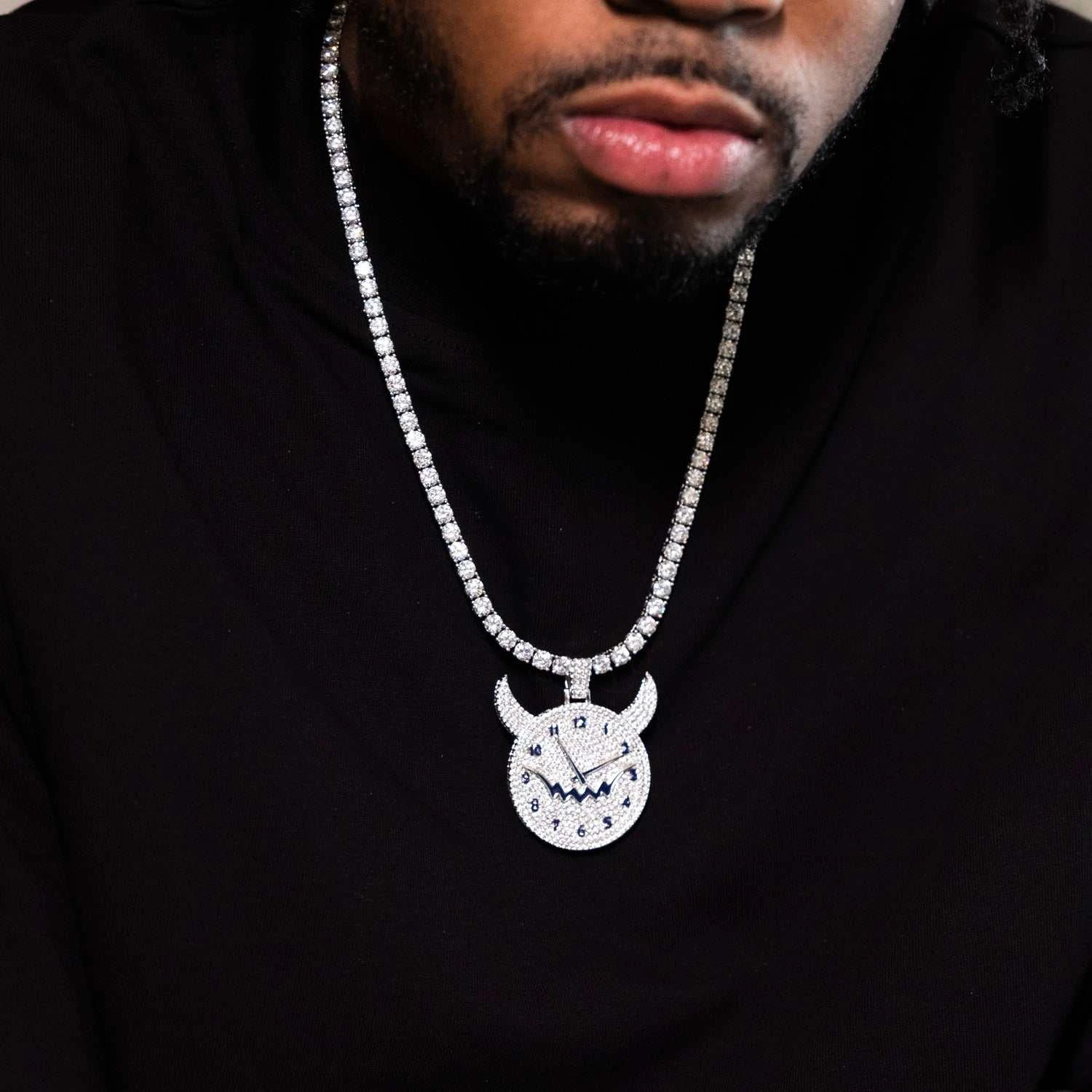 Introducing the Fivio Demon Time Pendant, a Limited Edition piece designed in conjunction with Fivio Foreign, the Brooklyn-based rapper. You can now rock the same custom designed for Fivio himself! This 14k white gold piece is perfect for a night out, you’ll be deep on demon time when you’re rocking this piece. Paired with the 5mm Round Cut Tennis Necklace in White Gold, they make a great combo.