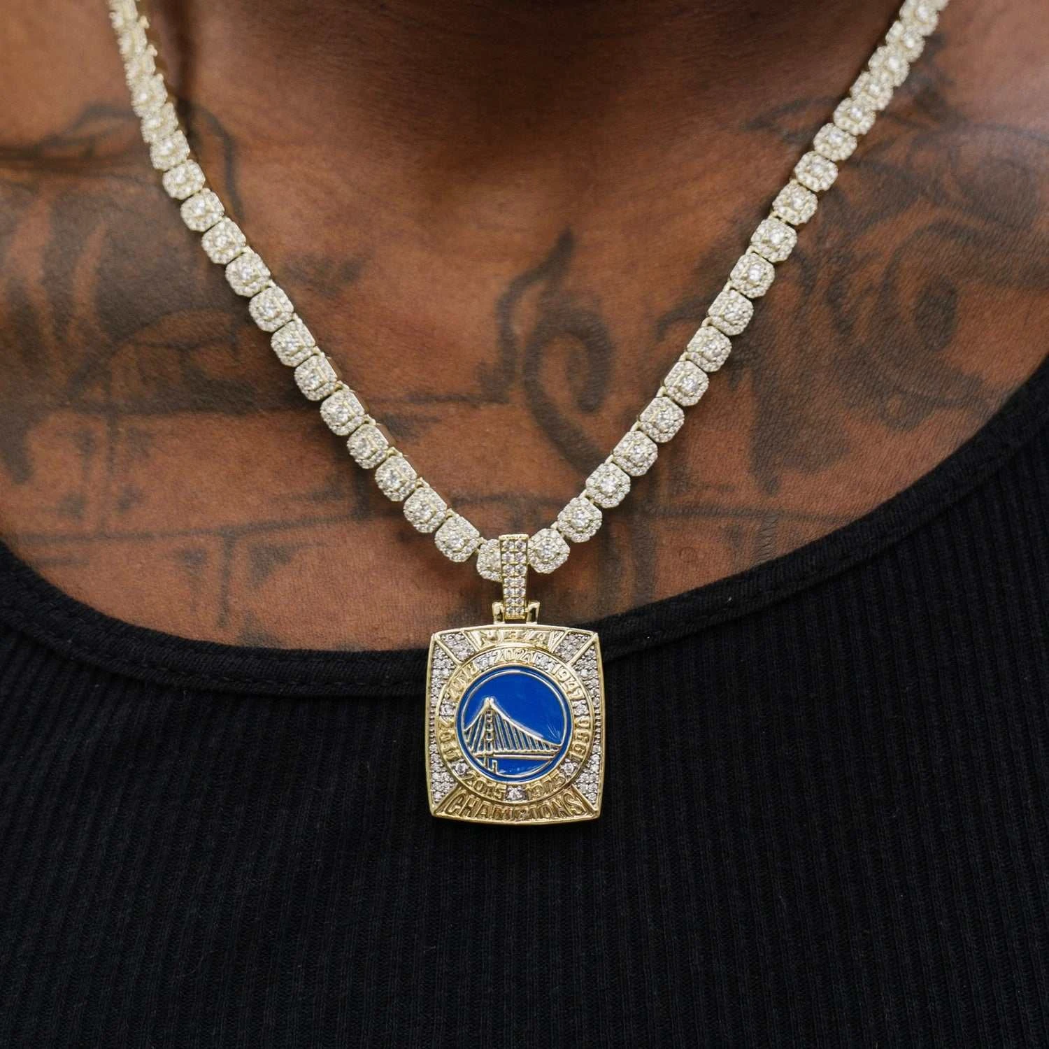 GLD has teamed up with the NBA to introduce the official NBA Championship Pendants. Celebrate the 7-Time World Champions with the Official Golden State Warriors Championship Pendant! This piece was meticulously crafted with clear hand-set stones and blue enamel to accurately depict the logo of the Golden State Warriors. Flex this NBA season with the official Warriors pendant. Paired with the Micro Clustered Tennis Necklace, they make a perfect match.