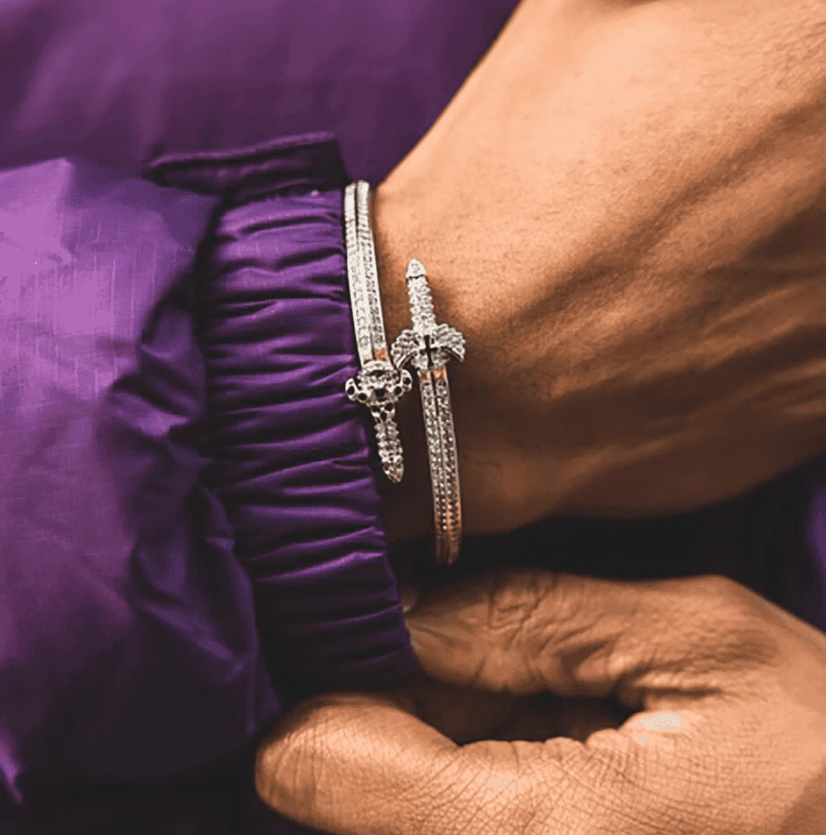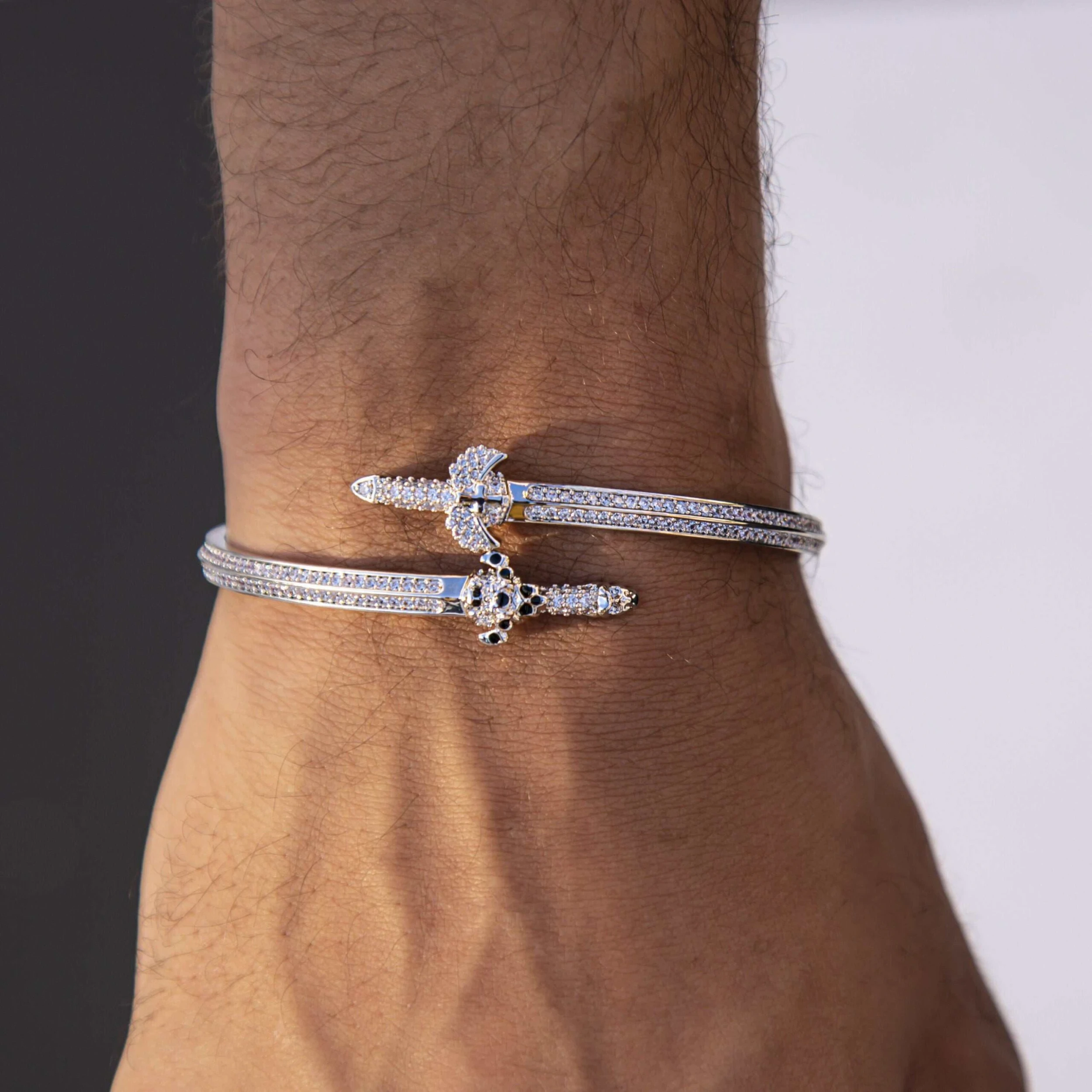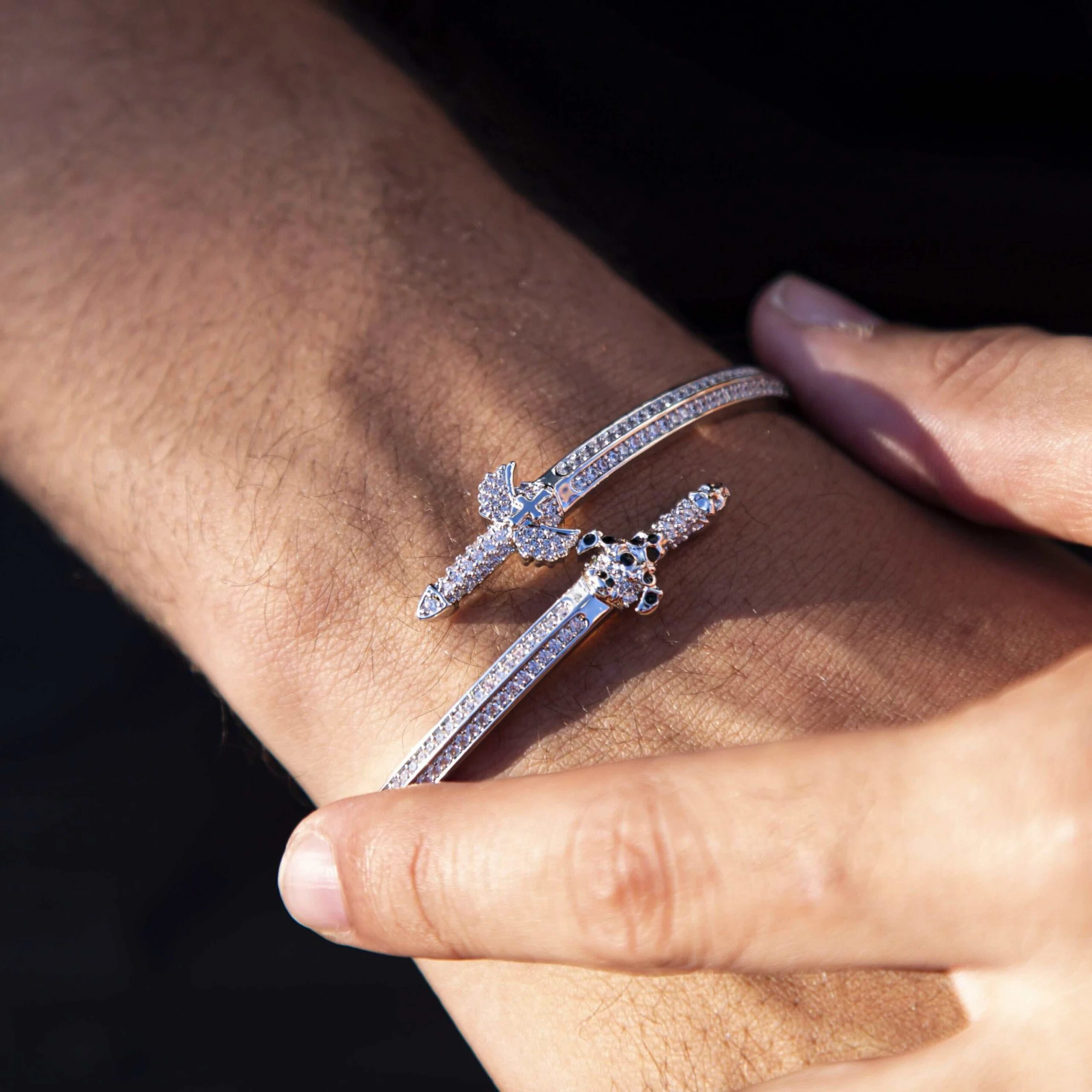 The Good vs Evil Bracelet is custom-designed for a sharp new look. This one of a kind piece features a double-sided diamond studded hilt design with two layers of accent stones around the cuff, forming the blade of both knives. Wear it alone, or pair it with any of our bestselling Bracelets. It’s the perfect complimentary piece.