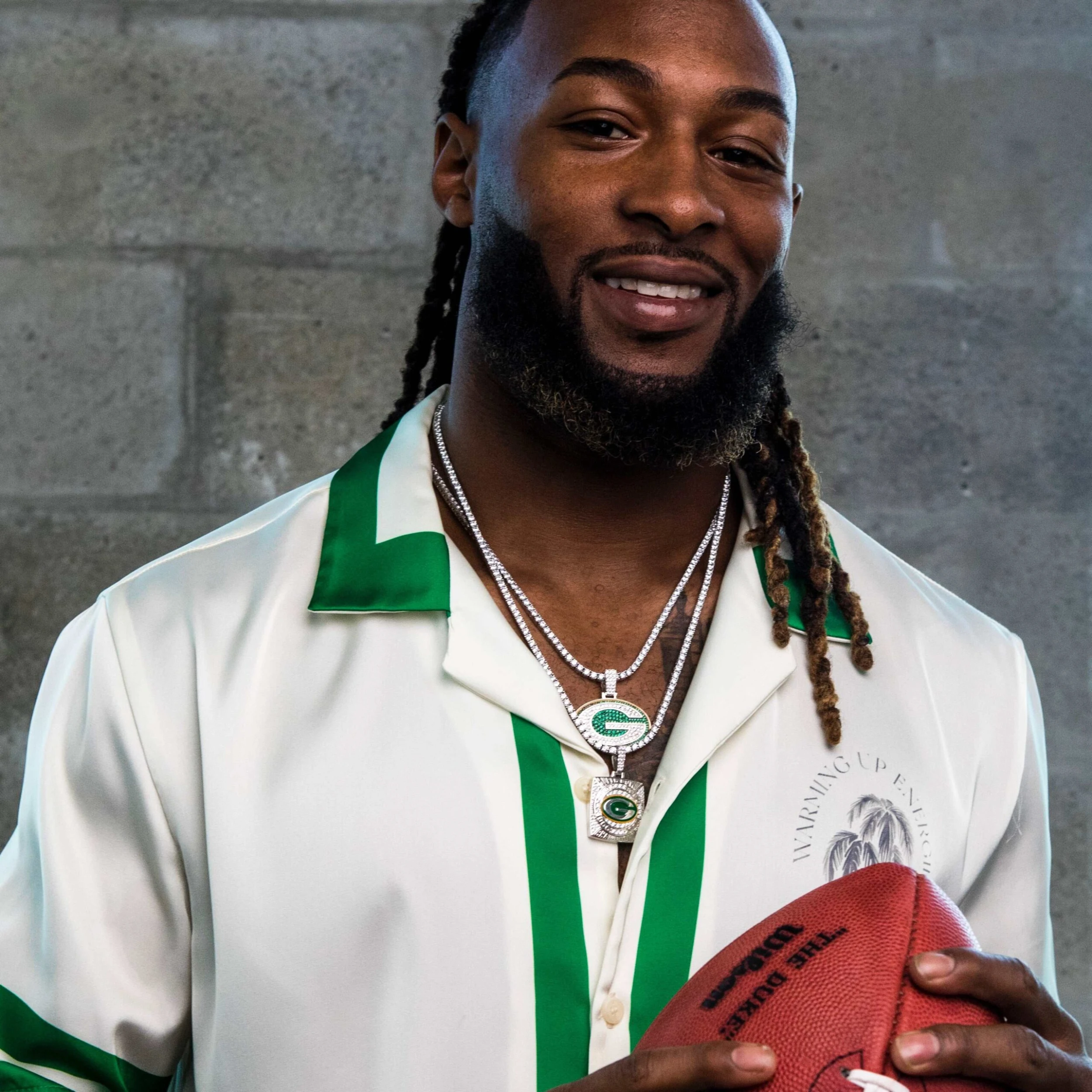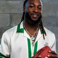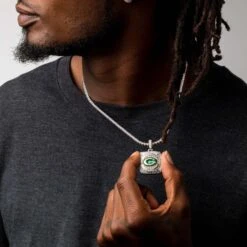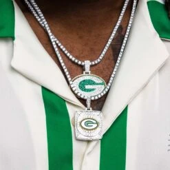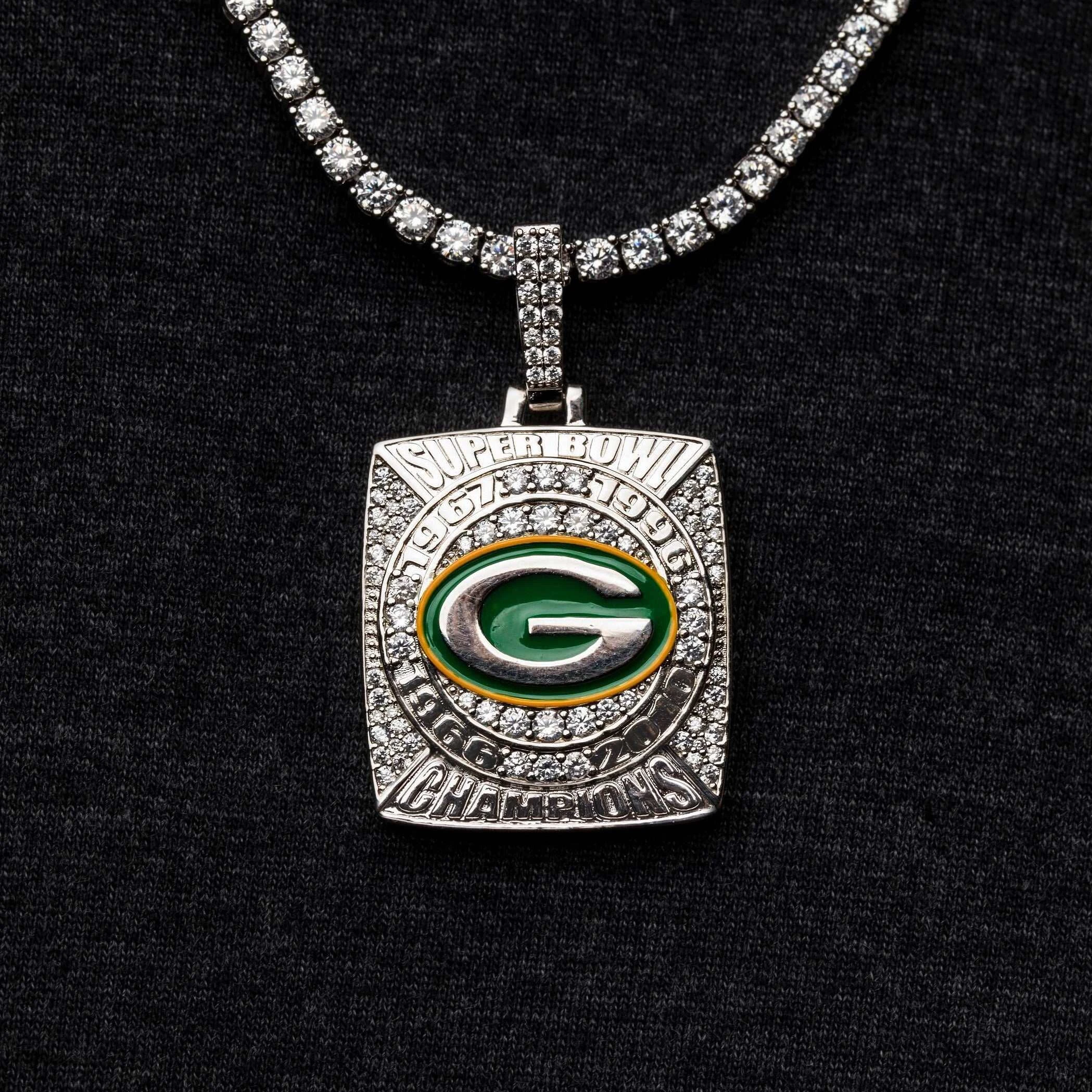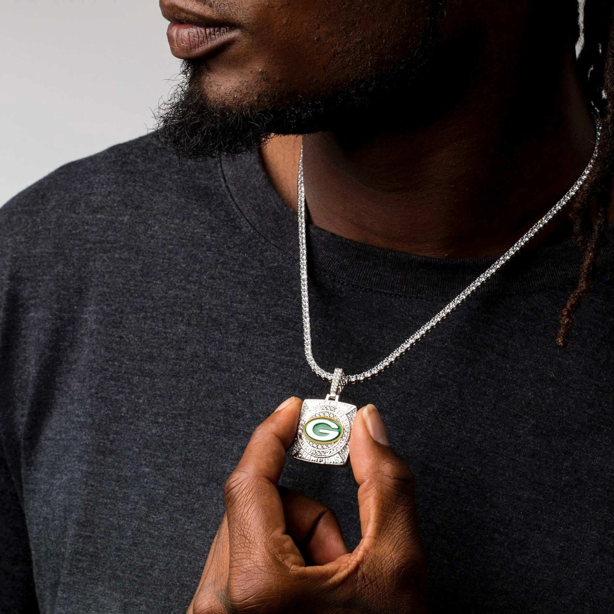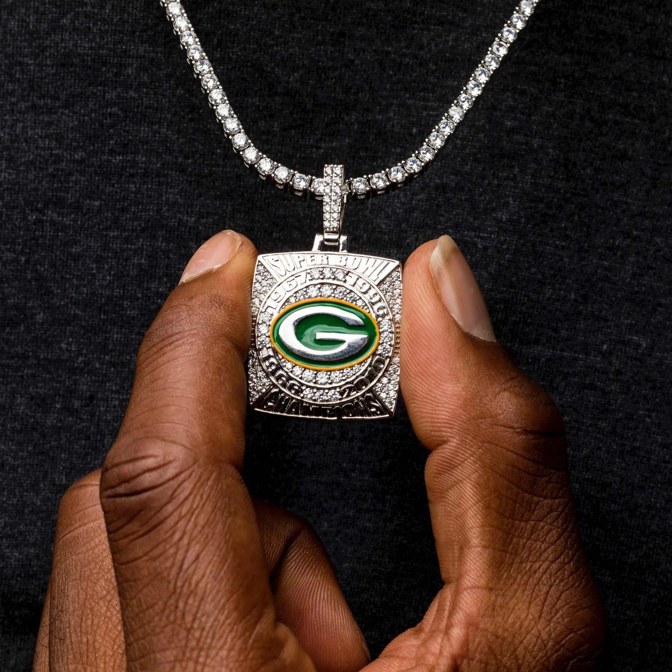 Celebrate the 4-Time World Champions with the Official Green Bay Packers Championship Pendant! This white gold plated pendant is a great way to celebrate your favorite team this season. Paired with the 3mm Tennis Chain, you have the perfect amount of ice to rep the Green Bay Packers just like Pro Bowler Aaron Jones (Pictured)