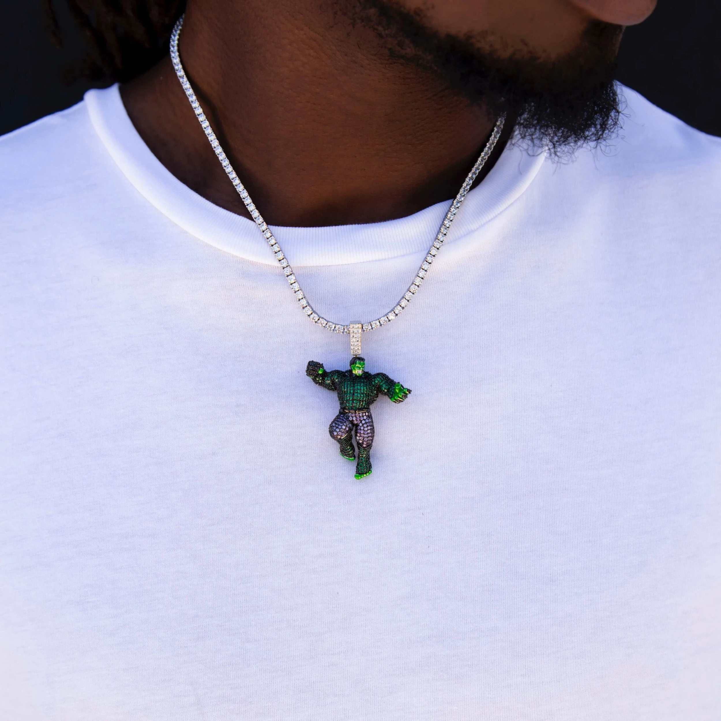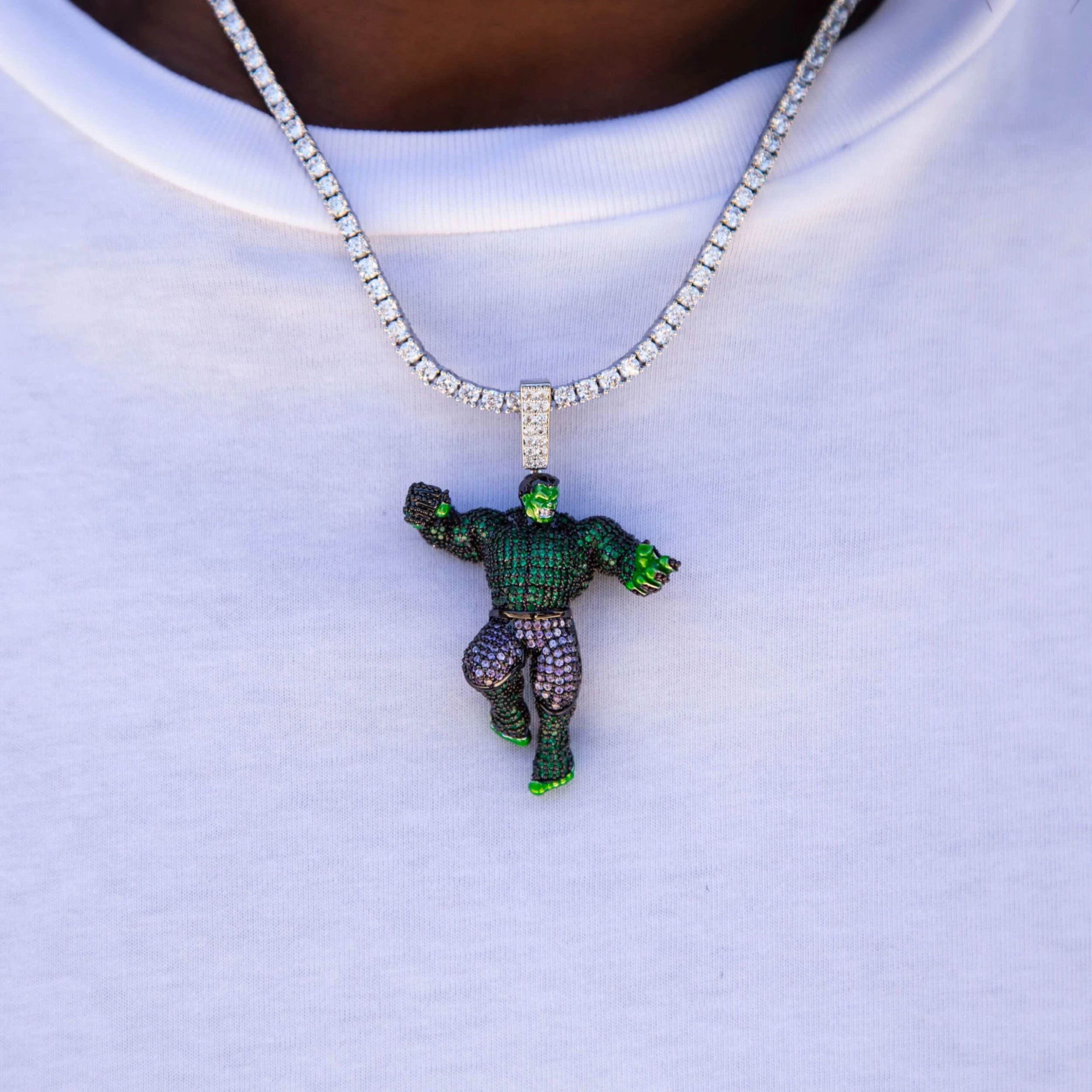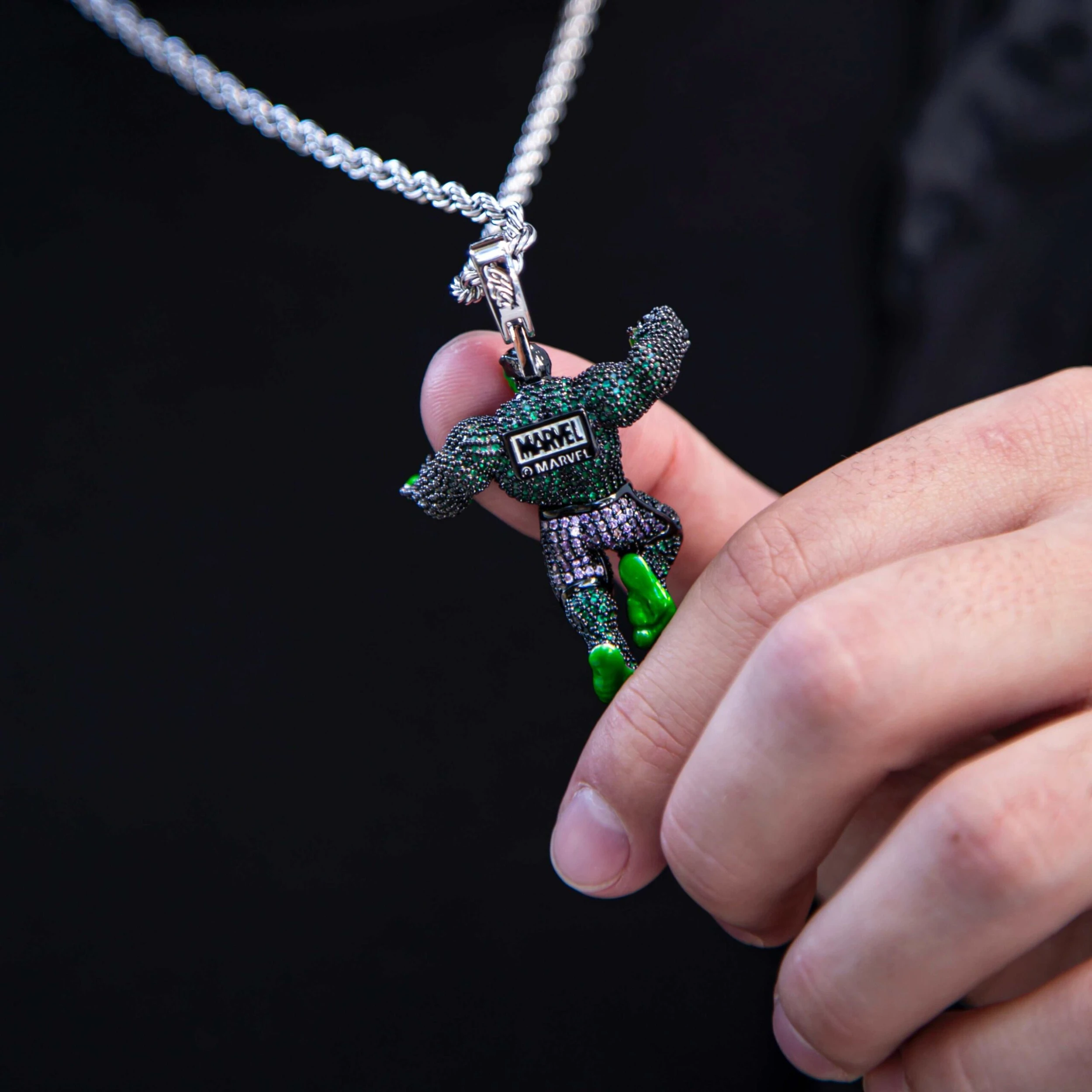 Introducing the Official pendants of the MARVEL Universe. This piece is flooded in green and purple hand-set stones, meticulously crafted with black and white enamel for the eyes and hair to accurately depict The Incredible Hulk.