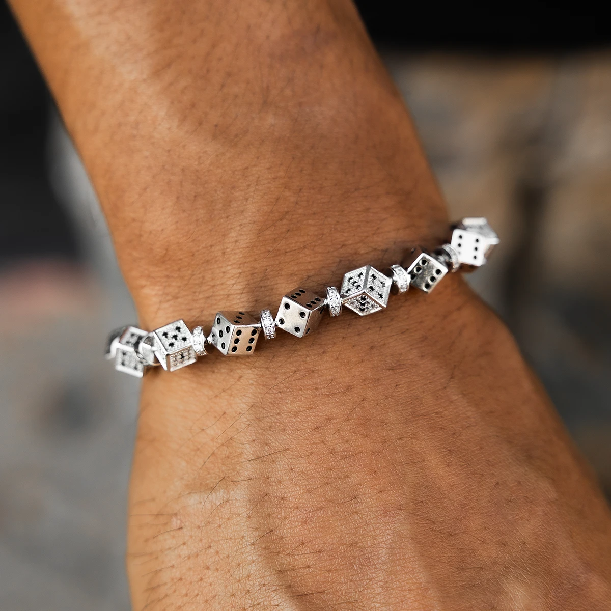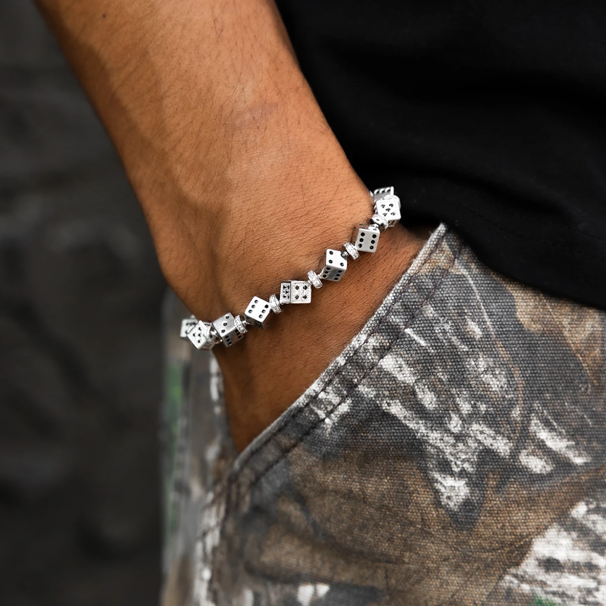 Introducing the Iced Dice Bracelet, this one’s an easy bet. Featuring iced die and roundels in 14k White Gold around an elastic band for easy on and off. So go ahead, roll the dice, and bring an edge to your style with this GLD exclusive. Pair it with the Dice Stud Earrings for a perfect set!
