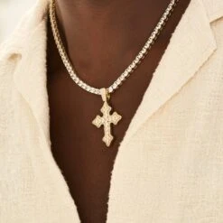 Introducing the Iced Gothic Cross in Yellow Gold – a bold addition to your pendant collection. Crafted with a durable 18k gold plated finish and hand-set stones, this cross is guaranteed to make a statement. Pair this piece with our 5mm Tennis Chain in Yellow Gold for a complete, elevated look.