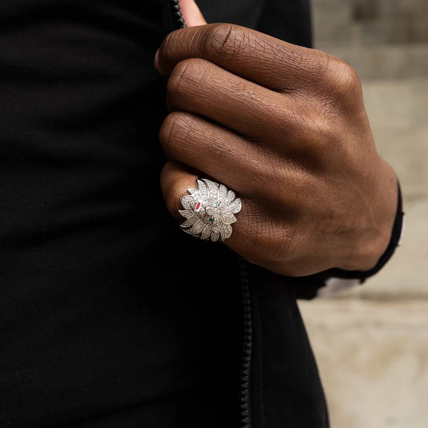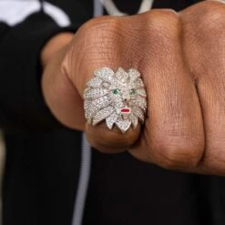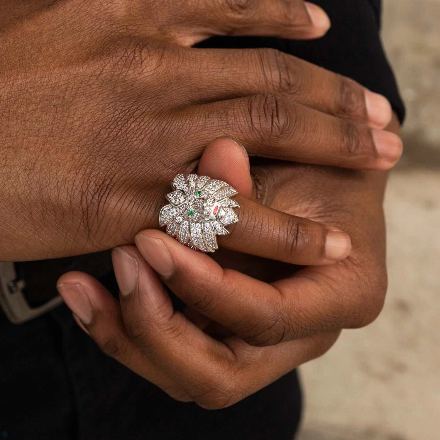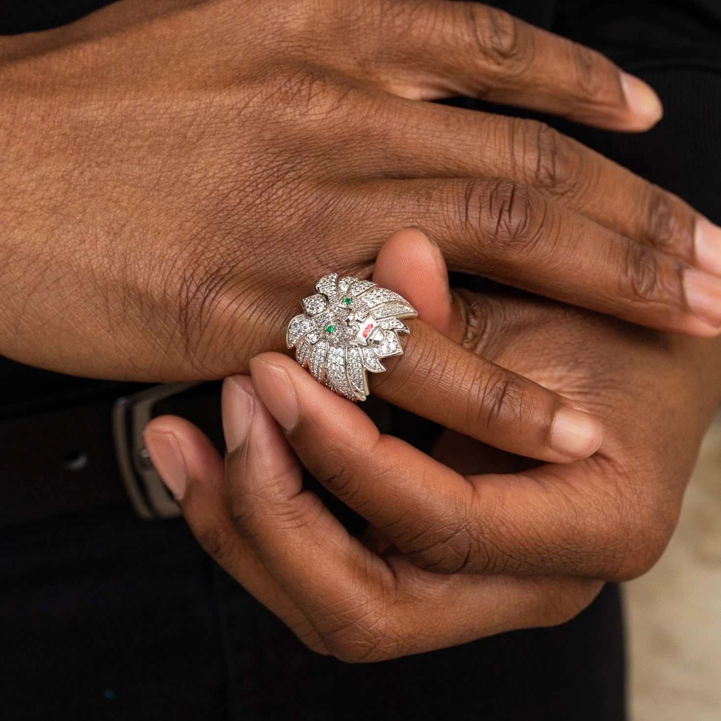 Introducing the Iced Lion Ring in 18k White Gold Vermeil, a one of a kind piece to add to your novelty collection. Covered in hand-set stones, this vermeil ring features the face of a lion with its mane wrapped around either side of a wide set band. Look closely to see its green crystal eyes, this impressively detailed ring will shine from any angle. Pair it with the 5mm Tennis Chain in White Gold to add a statement to your fit!