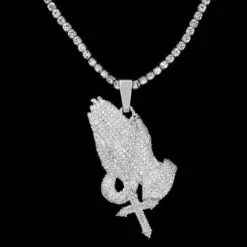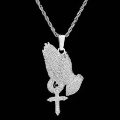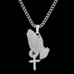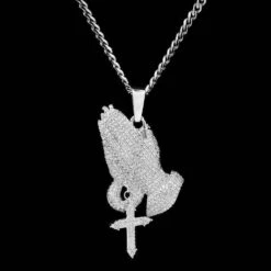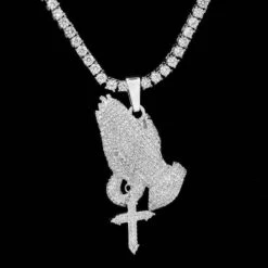 Bless Up. The Iced Praying Hands Pendant brings a new dimension to a classic piece with the addition of a miniature ball chain and a hanging cross. Get it now in White Gold.