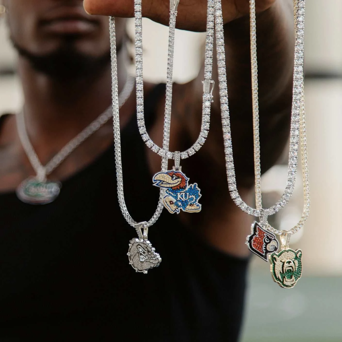 GLD has teamed up with the NCAA to introduce the official NCAA Team Pendants. This piece was meticulously crafted with multicolored hand-set stones to accurately depict the logo of the Kansas Jayhawks University football team. Flex this season with the official Logo Pendant of your Kansas Jayhawks!