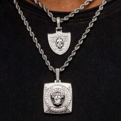 GLD has teamed up with the National Football League to introduce the official NFL Micro Logo Pendants. This piece was meticulously crafted with 14k white gold and clear hand-set stones to accurately depict the logo of the Raiders. Flex this NFL season with the official pendant of the Las Vegas Raiders.