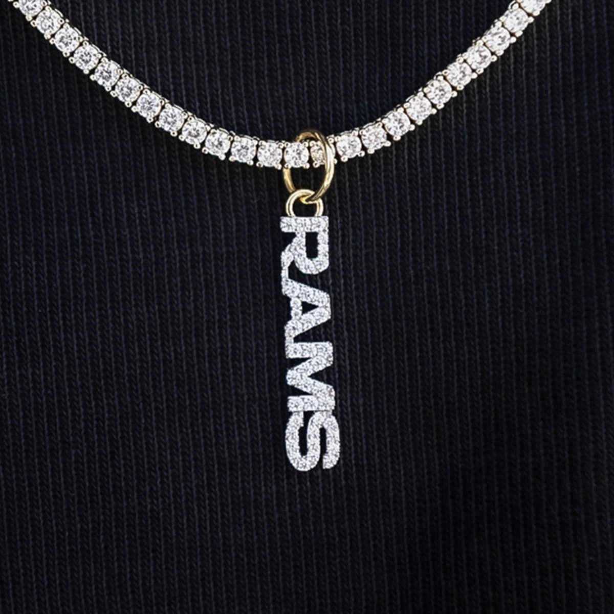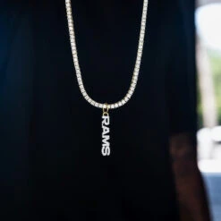 GLD has teamed up with the National Football League to introduce the official NFL Team Wordmark Pendants. This 18k Yellow Gold piece features the word “Rams” hanging vertically from the chain, and meticulously crafted with hand-set stones to represent the Los Angeles Rams. Pair this with the 3mm Tennis Chain in Yellow Gold pictured here to celebrate your team- WHOSE HOUSE?! RAMS HOUSE!