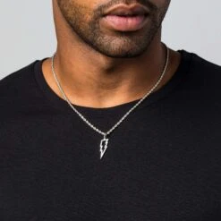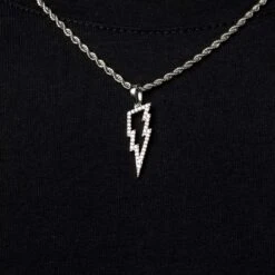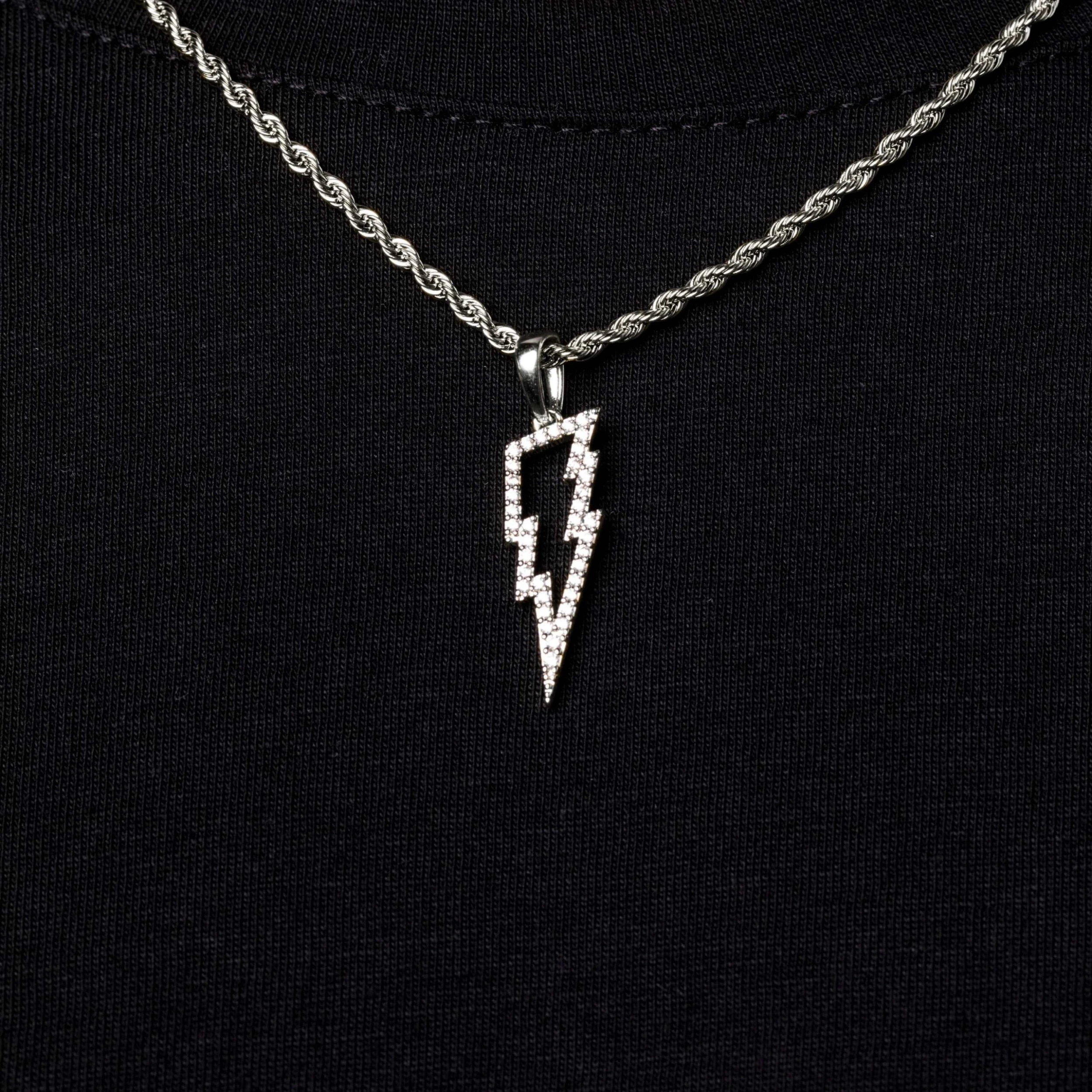 Introducing our “Micro Iced Lightning Bolt Pendant in White Gold” , this pendant features a hollow center and stones on the full piece except the bail. Styled with our “2mm Rope Chain In White Gold” they make the perfect pair. Wear it alone or style it with multiple chains for a layered look, this piece is the perfect touch of ice!