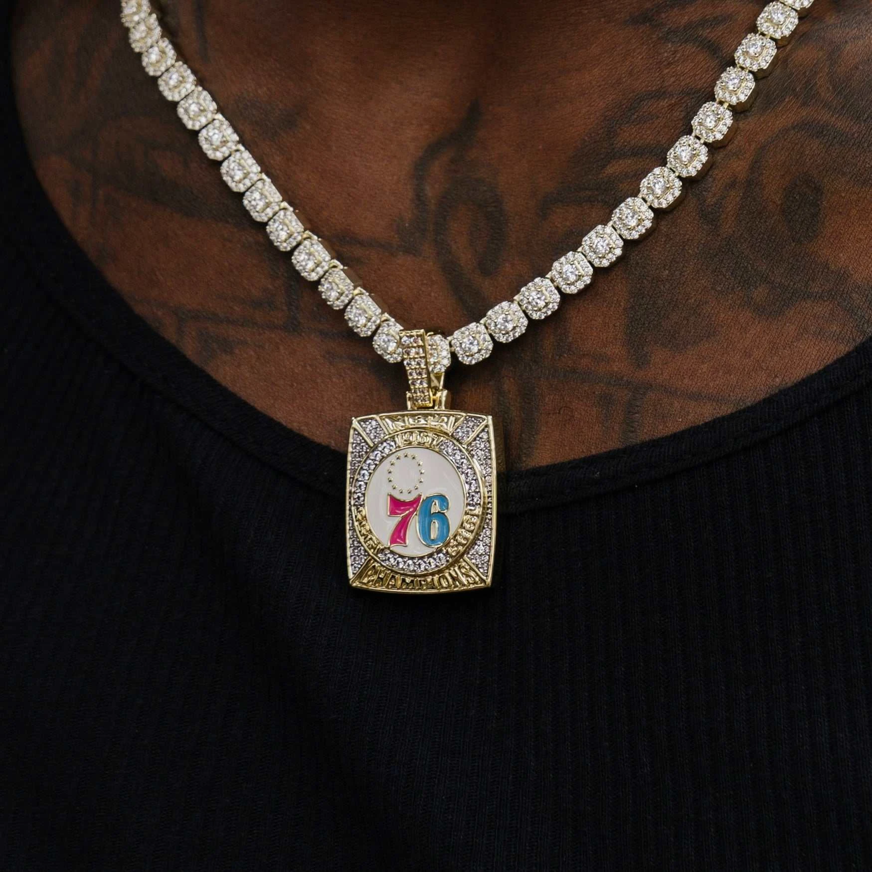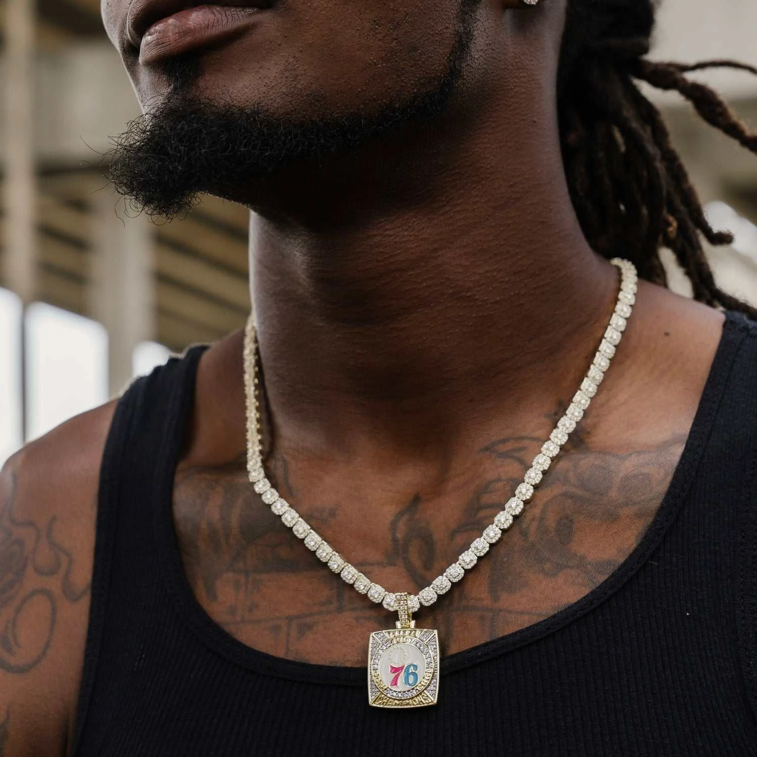 GLD has teamed up with the NBA to introduce the official NBA Championship Pendants. Celebrate the 3-Time World Champions with the Official Philadelphia 76ers Championship Pendant! This piece was meticulously crafted with clear hand-set stones, red and blue enamel to accurately depict the logo of the Philadelphia 76ers. Flex this NBA season with the official 76ers pendant. Paired with the Micro Clustered Tennis Necklace, they make a perfect match.