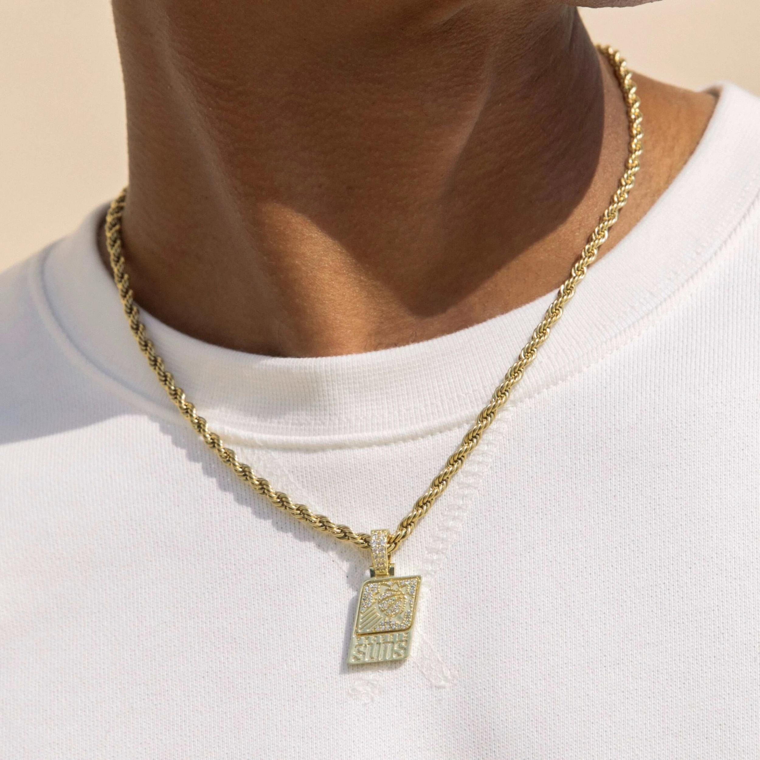 GLD has teamed up with the NBA to introduce the official NBA Team Pendants. This piece was meticulously crafted with white and clear hand-set stones to accurately depict the iconic logo of the Phoenix Suns. Flex this NBA season with the official pendant of the Phoenix Suns.