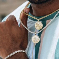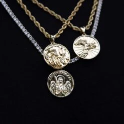 Introducing our “Saint Michael Coin Pendant” a medium sized, yellow gold coin pendant to pair with your favorite chain. Saint Michael with his sword represents him as the champion of justice. This saint is also known to be a healer of the sick, and the guardian of the Church. To style it as in the picture above, take a look at our “3mm Tennis Chain In Yellow Gold” .