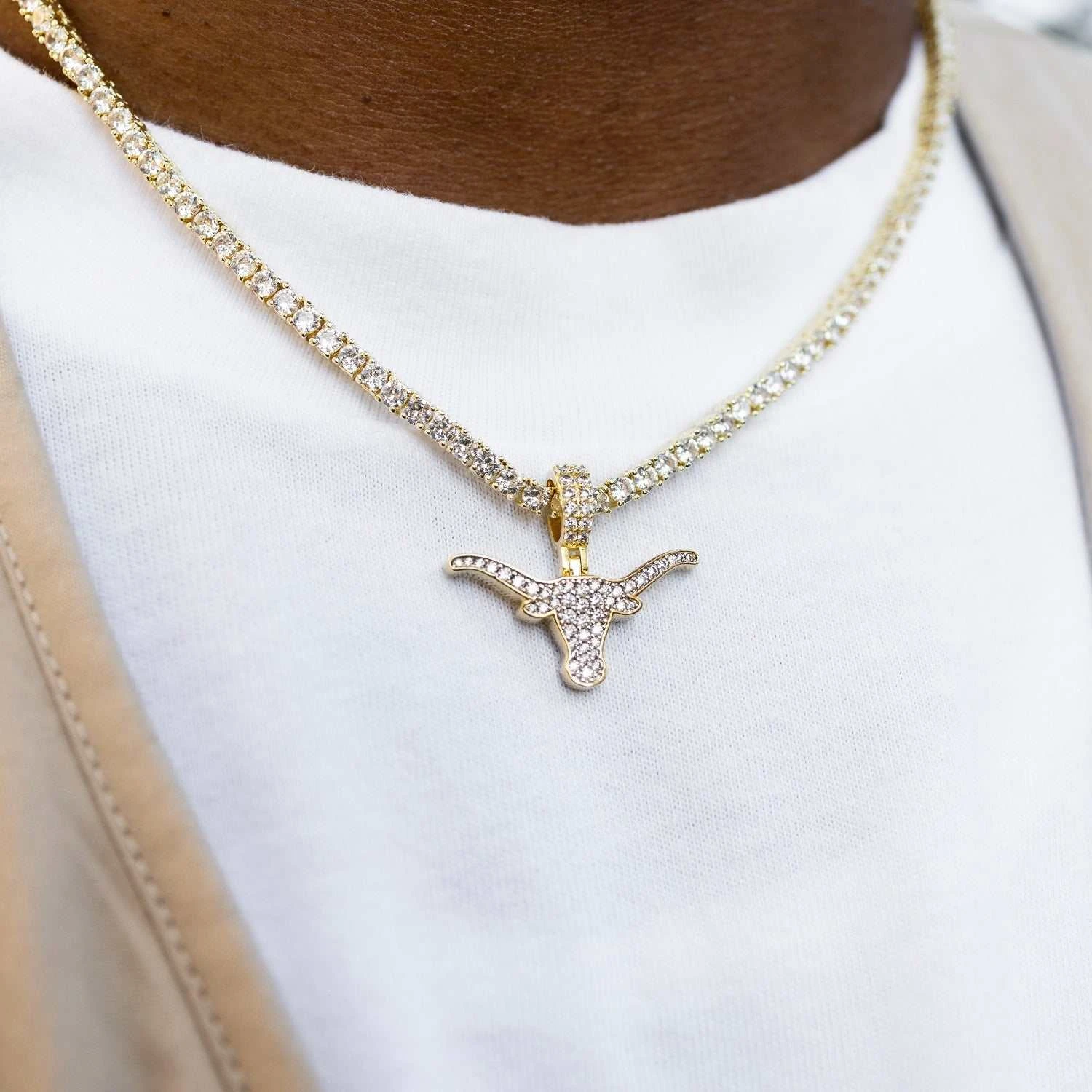 Introducing the Texas Longhorns Micro Logo Pendant, a great new way to rep your school this season. This 18k gold plated pendant is covered in clear, hand-set stones to accurately depict the logo for the University of Texas. Paired with the 3mm Tennis Necklace in Yellow Gold, it makes a perfect match! Hook ‘Em Horns!
