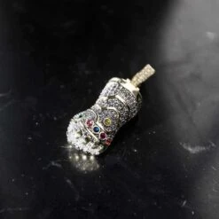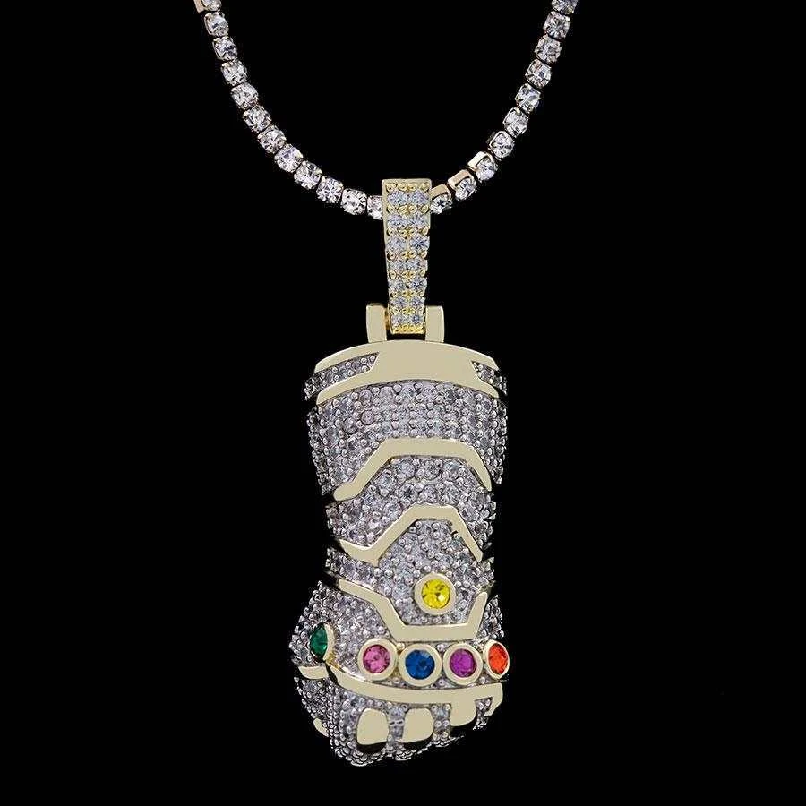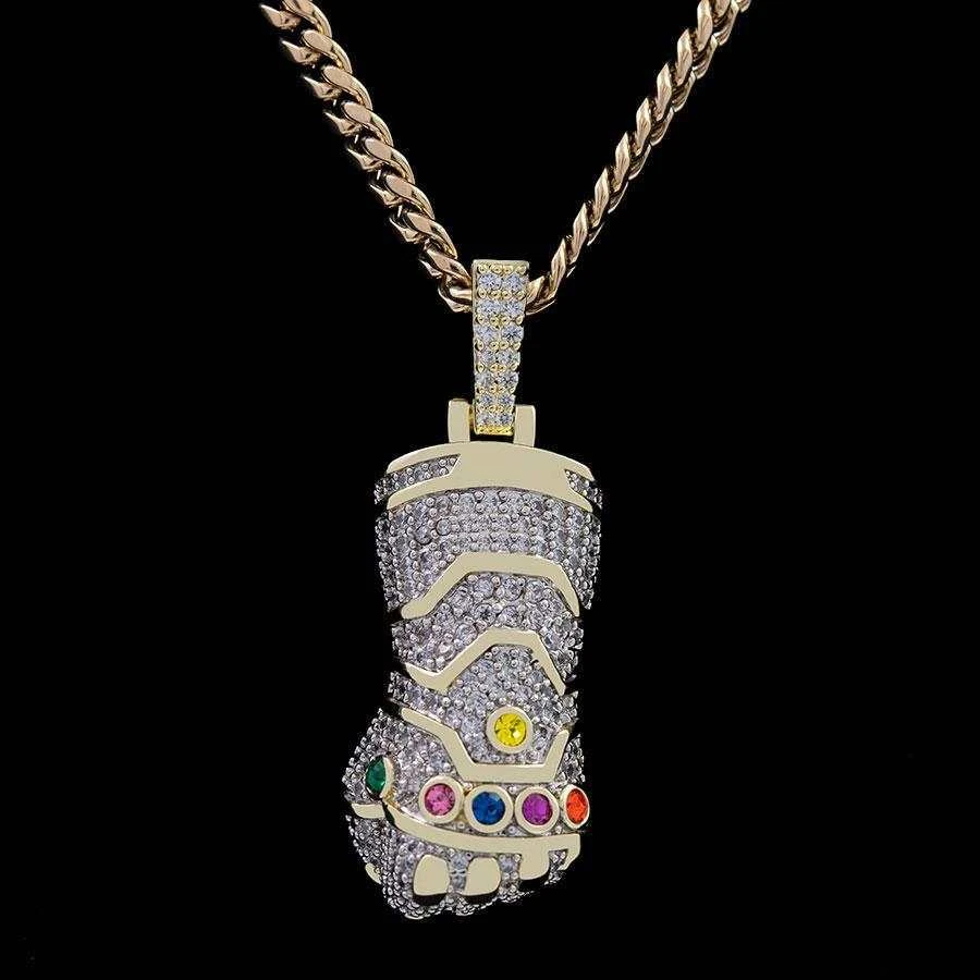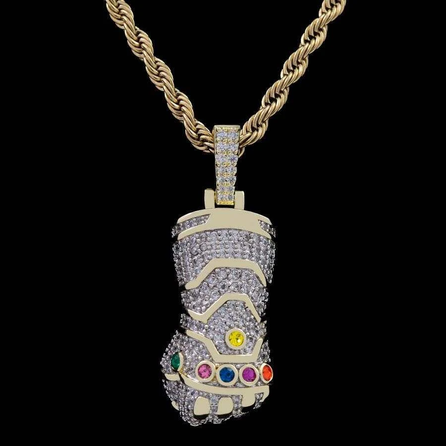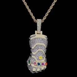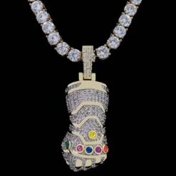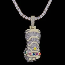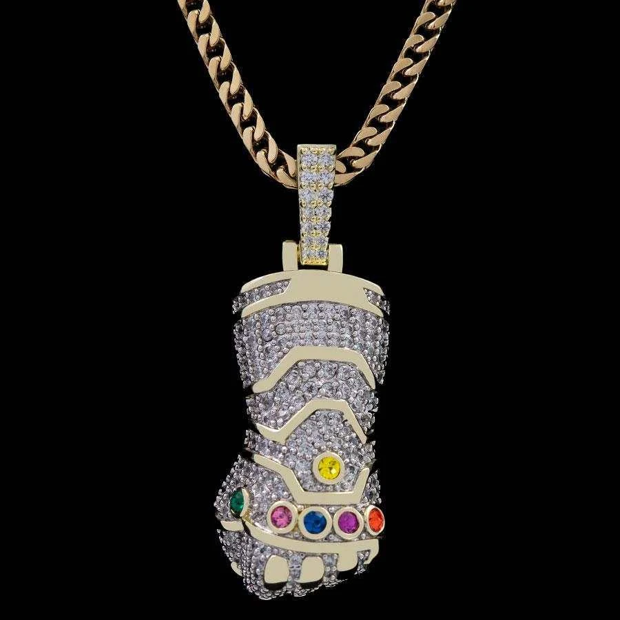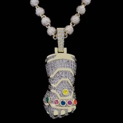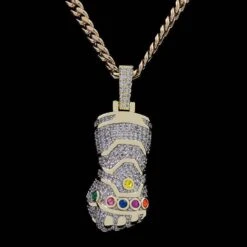 Introducing the Official pendants of the MARVEL Universe. This iconic piece demands attention. Flooded in clear hand-set round cut stones, finished in 18k Gold Plating, this pendant is crafted meticulously to accurately depict Thanos’ Infinity Gauntlet.