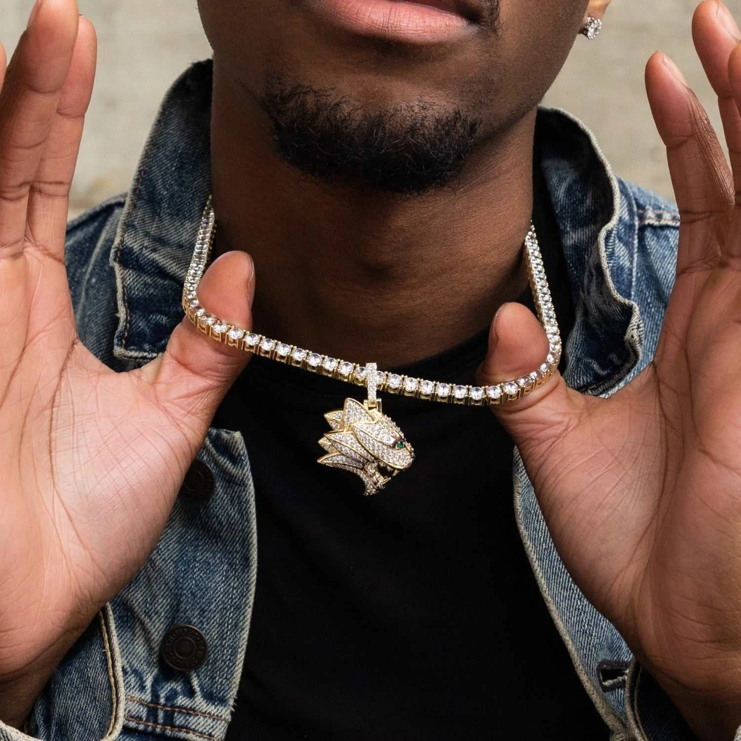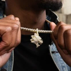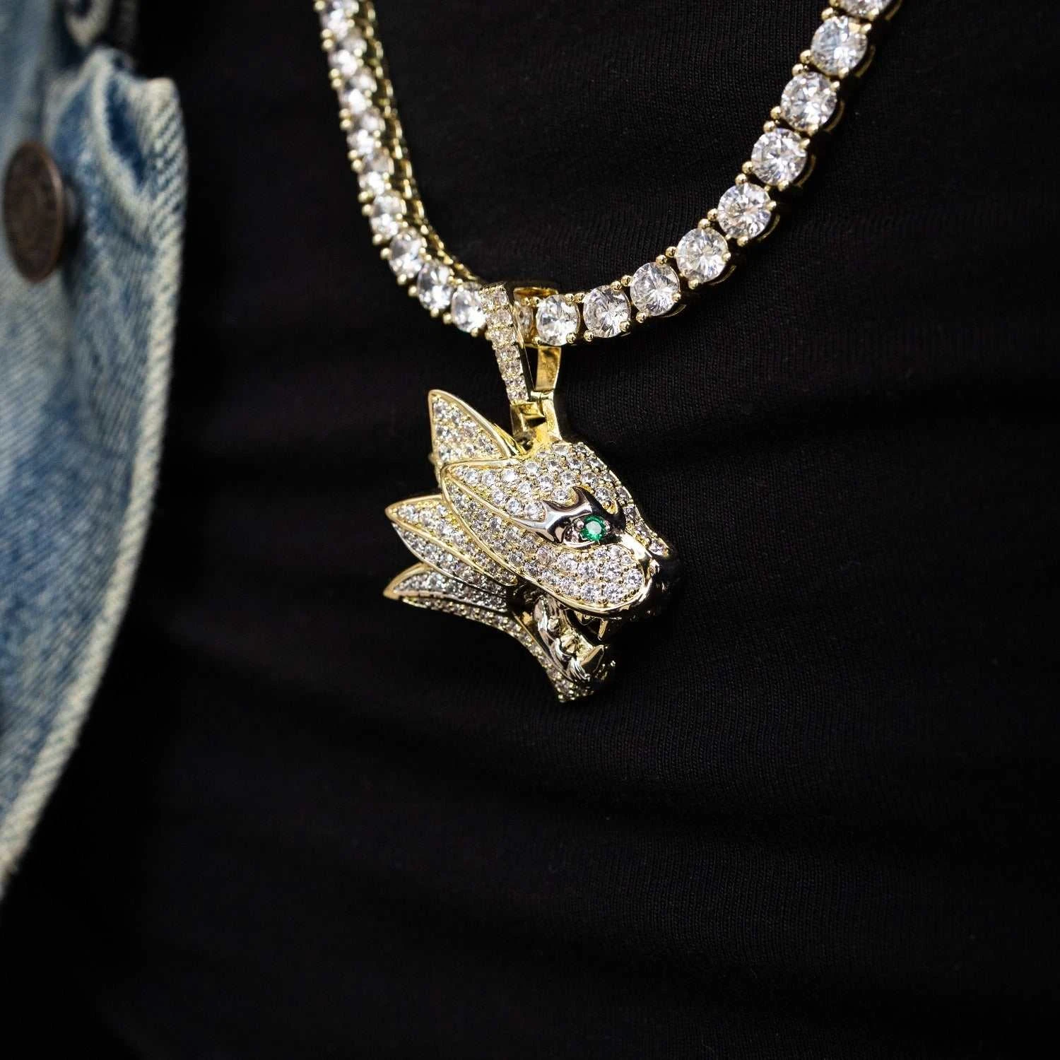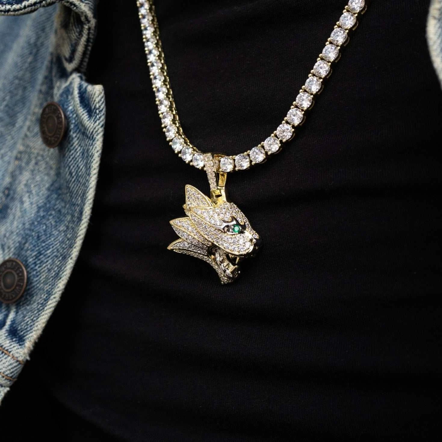 Introducing the Wildcat Pendant, plated in 18k Yellow Gold. This unique piece features the head of a roaring wildcat along with a profile view of its layered mane in gold accents and hand-set stones. The cat’s green crystal eyes shine from every angle and compliment its sharp gold teeth. Pair this with the 5mm Tennis Chain in Yellow Gold to complete the perfect set.